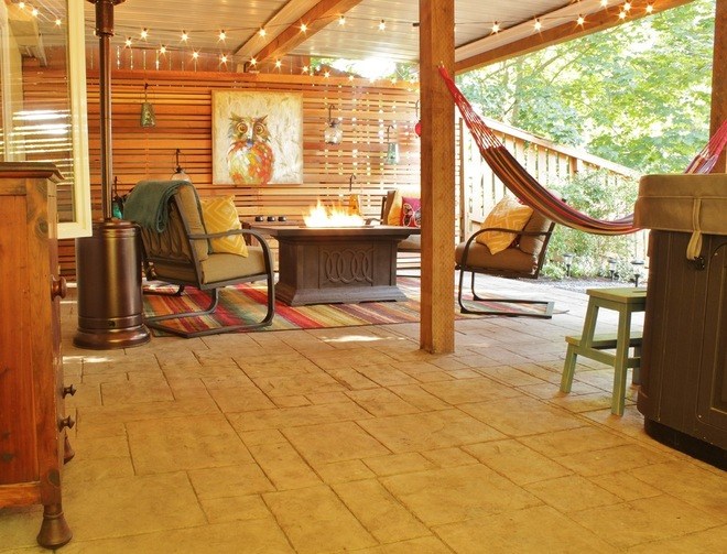 AFTER: The back master bedroom door leads directly onto the new backyard patio, complete with hot tub, hammock, fire pit, heat lamp and comfortable seating.