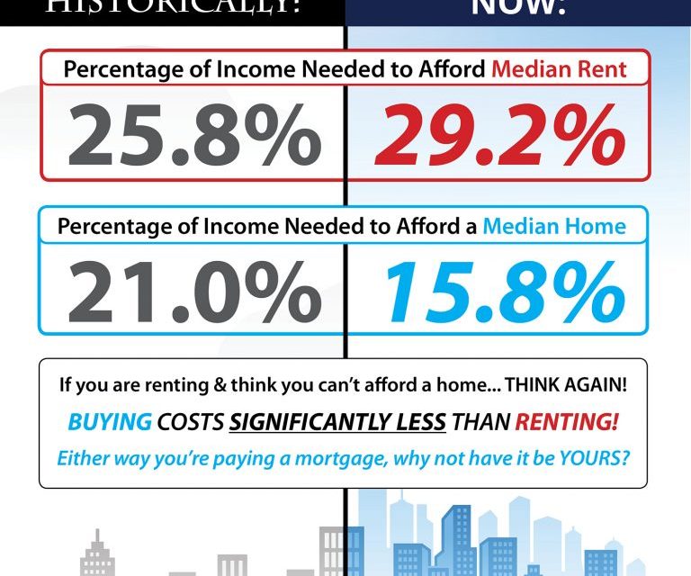 - Looking at the percentage of income needed to rent a median-priced home today (29.2%) vs. the percentage needed to buy a median-priced home (15.8%), the choice becomes obvious.