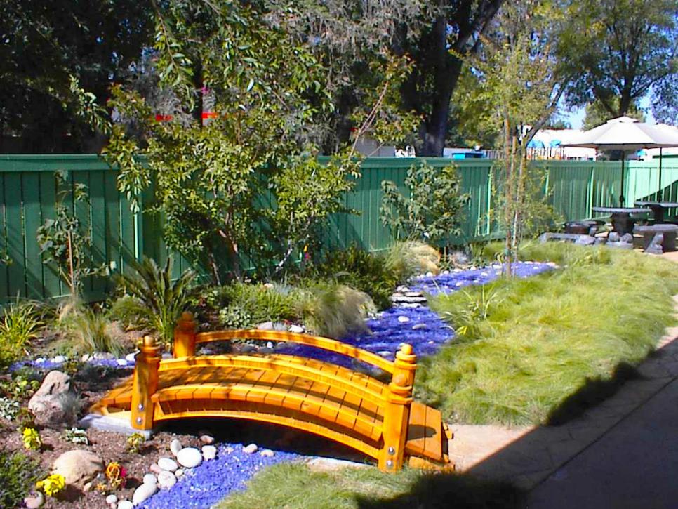 Tumbled-Glass “river” runs through this garden, featuring a footbridge, ornamental grasses, crepe myrtles and creeping fescue.
