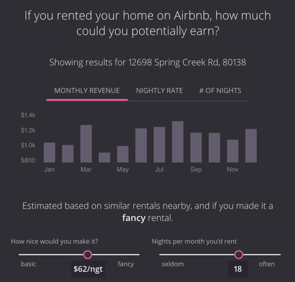 Homebot helps homeowners estimate what they could do with their extra money from Airbnb earnings and the Airbnb website helps potential hosts understand the value and potential earnings for a specific location.