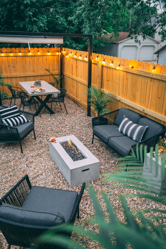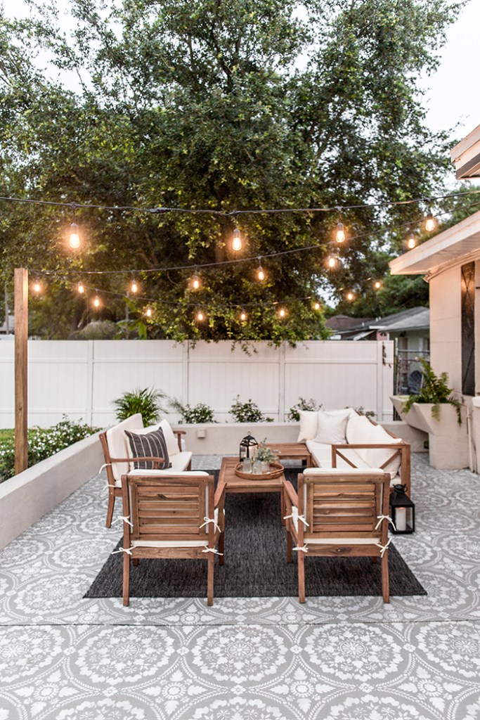This backyard makeover turned a drab yard into a dreamy Boho Modern Garden. The stenciled cement adds a pop to the neutral space and the adirondack chairs look like the perfect place to relax after a long day.