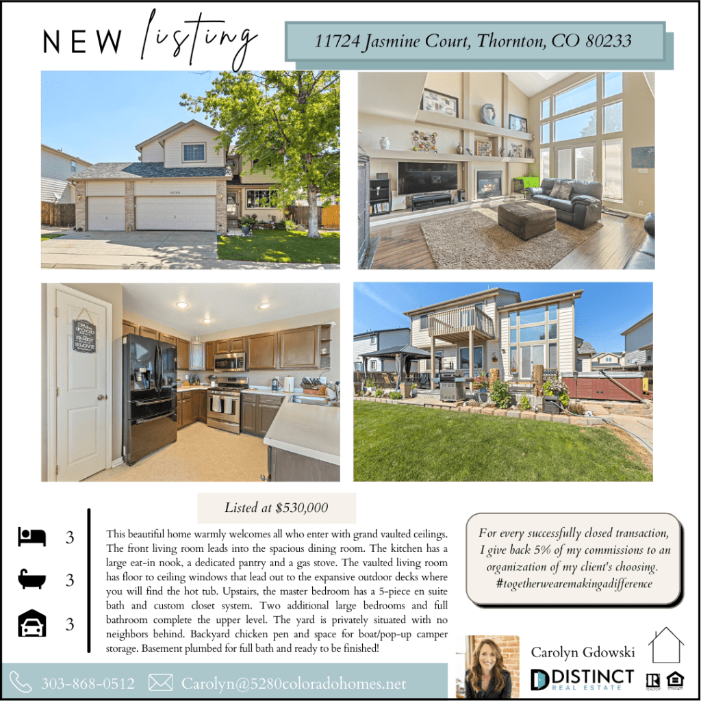 NEW LISTING- 11724 Jasmine Court, Thornton, CO 80233 July 4, 2021 nwdenvercoloradoliving Click here to view the video walk through. Share this: Click to share on X (Opens in new window) X Click to share on Facebook (Opens in new window) Facebook Click to share on LinkedIn (Opens in new window) LinkedIn Like Loading... Related